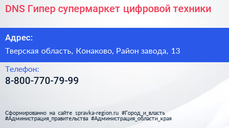 DNS Гипер, супермаркет цифровой техники по адресу Тверская область, Конаково, Район завода, 13 в дальнейшем Организация, размещена в следующих категориях: