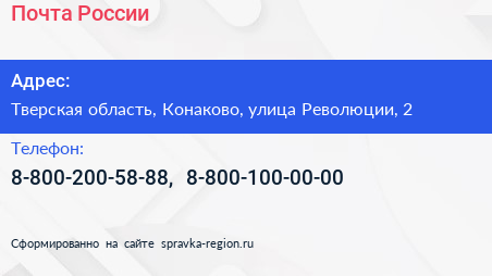 Почта России по адресу Тверская область, Конаково, улица Революции, 2 в дальнейшем Организация, размещена в следующих категориях: