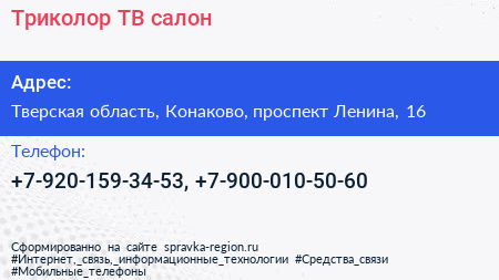 Триколор ТВ, салон по адресу Тверская область, Конаково, проспект Ленина, 16 в дальнейшем Организация, размещена в следующих категориях: