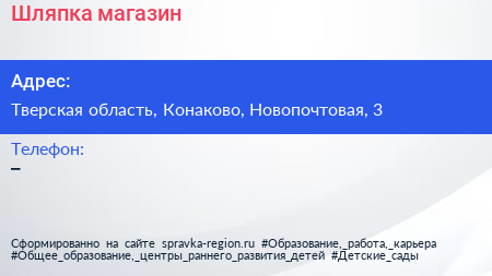 Шляпка, магазин по адресу Тверская область, Конаково, Новопочтовая, 3 в дальнейшем Организация, размещена в следующих категориях: