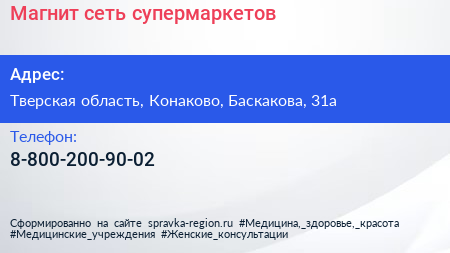 Магнит, сеть супермаркетов по адресу Тверская область, Конаково, Баскакова, 31а в дальнейшем Организация, размещена в следующих категориях: