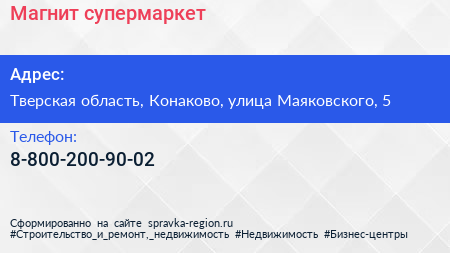 Магнит, супермаркет по адресу Тверская область, Конаково, улица Маяковского, 5 в дальнейшем Организация, размещена в следующих категориях: