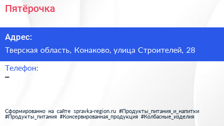 Пятёрочка по адресу Тверская область, Конаково, улица Строителей, 28 в дальнейшем Организация, размещена в следующих категориях: