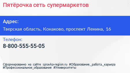 Пятёрочка, сеть супермаркетов по адресу Тверская область, Конаково, проспект Ленина, 16 в дальнейшем Организация, размещена в следующих категориях: