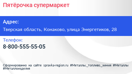 Пятёрочка, супермаркет по адресу Тверская область, Конаково, улица Энергетиков, 28 в дальнейшем Организация, размещена в следующих категориях: