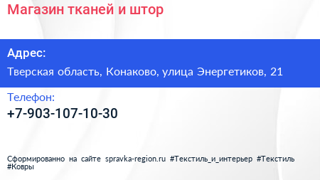Магазин тканей и штор по адресу Тверская область, Конаково, улица Энергетиков, 21 в дальнейшем Организация, размещена в следующих категориях: