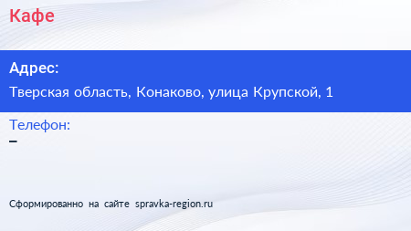 Кафе по адресу Тверская область, Конаково, улица Крупской, 1 в дальнейшем Организация, размещена в следующих категориях: