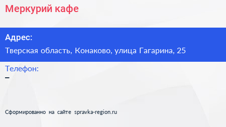 Меркурий, кафе по адресу Тверская область, Конаково, улица Гагарина, 25 в дальнейшем Организация, размещена в следующих категориях: