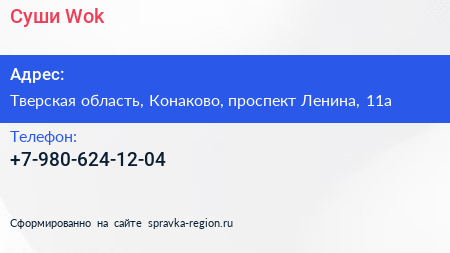 Суши Wok по адресу Тверская область, Конаково, проспект Ленина, 11а в дальнейшем Организация, размещена в следующих категориях: