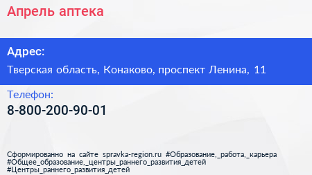 Апрель, аптека по адресу Тверская область, Конаково, проспект Ленина, 11 в дальнейшем Организация, размещена в следующих категориях: