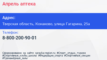 Апрель, аптека по адресу Тверская область, Конаково, улица Гагарина, 25а в дальнейшем Организация, размещена в следующих категориях: