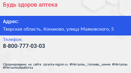 Будь здоров!, аптека по адресу Тверская область, Конаково, улица Маяковского, 5 в дальнейшем Организация, размещена в следующих категориях: