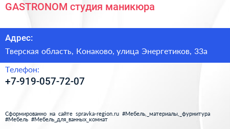 GASTRONOM, студия маникюра по адресу Тверская область, Конаково, улица Энергетиков, 33а в дальнейшем Организация, размещена в следующих категориях: