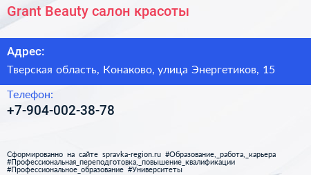 Grant Beauty, салон красоты по адресу Тверская область, Конаково, улица Энергетиков, 15 в дальнейшем Организация, размещена в следующих категориях: