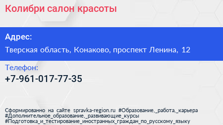 Колибри, салон красоты по адресу Тверская область, Конаково, проспект Ленина, 12 в дальнейшем Организация, размещена в следующих категориях: