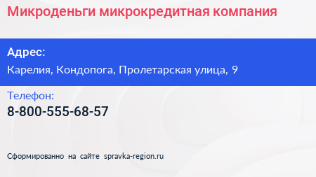 Микроденьги, микрокредитная компания по адресу Карелия, Кондопога, Пролетарская улица, 9 в дальнейшем Организация, размещена в следующих категориях: