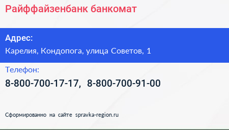 Райффайзенбанк, банкомат по адресу Карелия, Кондопога, улица Советов, 1 в дальнейшем Организация, размещена в следующих категориях: