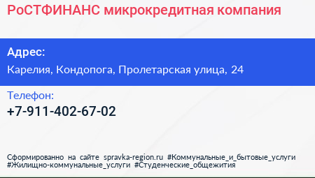 РоСТФИНАНС, микрокредитная компания по адресу Карелия, Кондопога, Пролетарская улица, 24 в дальнейшем Организация, размещена в следующих категориях: