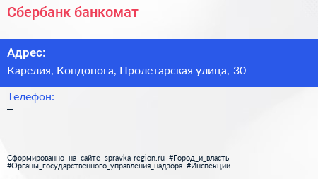 Сбербанк, банкомат по адресу Карелия, Кондопога, Пролетарская улица, 30 в дальнейшем Организация, размещена в следующих категориях: