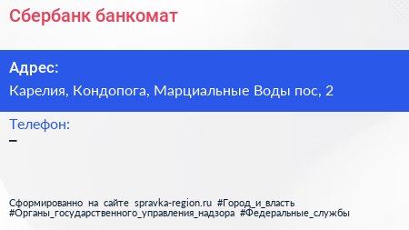 Сбербанк, банкомат по адресу Карелия, Кондопога, Марциальные Воды пос, 2 в дальнейшем Организация, размещена в следующих категориях: