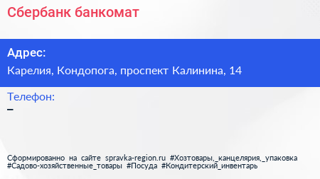 Сбербанк, банкомат по адресу Карелия, Кондопога, проспект Калинина, 14 в дальнейшем Организация, размещена в следующих категориях: