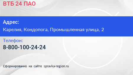 ВТБ 24, ПАО по адресу Карелия, Кондопога, Промышленная улица, 2 в дальнейшем Организация, размещена в следующих категориях: