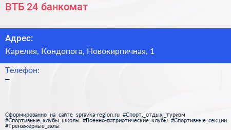ВТБ 24, банкомат по адресу Карелия, Кондопога, Новокирпичная, 1 в дальнейшем Организация, размещена в следующих категориях: