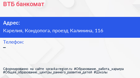 ВТБ, банкомат по адресу Карелия, Кондопога, проезд Калинина, 116 в дальнейшем Организация, размещена в следующих категориях: