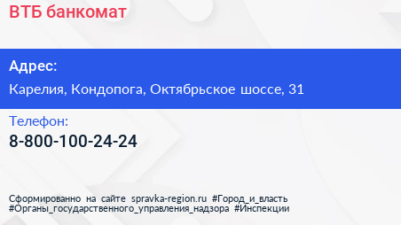 ВТБ, банкомат по адресу Карелия, Кондопога, Октябрьское шоссе, 31 в дальнейшем Организация, размещена в следующих категориях: