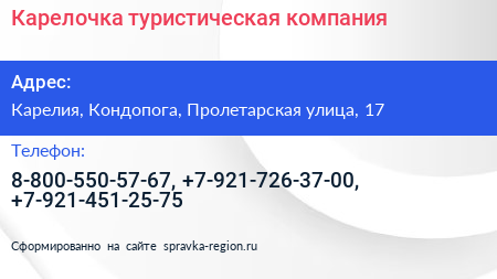 Карелочка, туристическая компания по адресу Карелия, Кондопога, Пролетарская улица, 17 в дальнейшем Организация, размещена в следующих категориях: