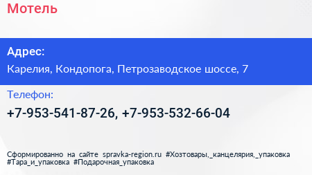 Мотель по адресу Карелия, Кондопога, Петрозаводское шоссе, 7 в дальнейшем Организация, размещена в следующих категориях: