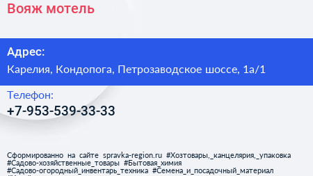 Вояж, мотель по адресу Карелия, Кондопога, Петрозаводское шоссе, 1а/1 в дальнейшем Организация, размещена в следующих категориях: