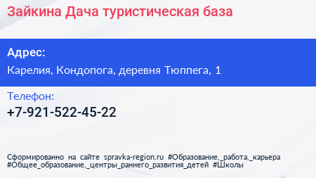 Зайкина Дача, туристическая база по адресу Карелия, Кондопога, деревня Тюппега, 1 в дальнейшем Организация, размещена в следующих категориях: