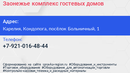 Заонежье, комплекс гостевых домов по адресу Карелия, Кондопога, посёлок Больничный, 1 в дальнейшем Организация, размещена в следующих категориях: