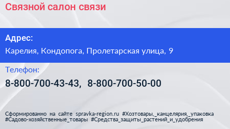 Связной, салон связи по адресу Карелия, Кондопога, Пролетарская улица, 9 в дальнейшем Организация, размещена в следующих категориях: