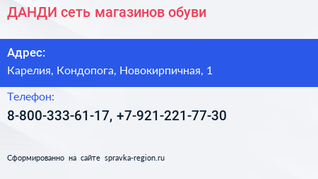 ДАНДИ, сеть магазинов обуви по адресу Карелия, Кондопога, Новокирпичная, 1 в дальнейшем Организация, размещена в следующих категориях: