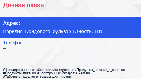 Дачная лавка по адресу Карелия, Кондопога, бульвар Юности, 18а в дальнейшем Организация, размещена в следующих категориях:
