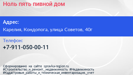 Ноль пять, пивной дом по адресу Карелия, Кондопога, улица Советов, 40г в дальнейшем Организация, размещена в следующих категориях: