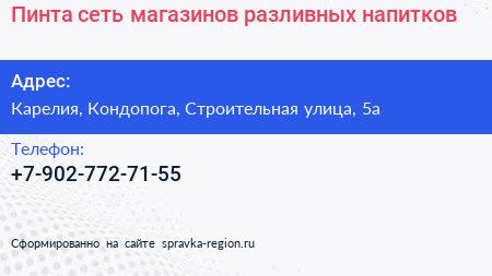 Пинта, сеть магазинов разливных напитков по адресу Карелия, Кондопога, Строительная улица, 5а в дальнейшем Организация, размещена в следующих категориях: