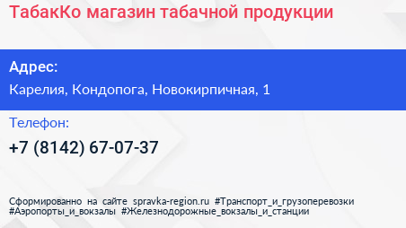 ТабакКо, магазин табачной продукции по адресу Карелия, Кондопога, Новокирпичная, 1 в дальнейшем Организация, размещена в следующих категориях: