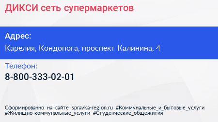 ДИКСИ, сеть супермаркетов по адресу Карелия, Кондопога, проспект Калинина, 4 в дальнейшем Организация, размещена в следующих категориях: