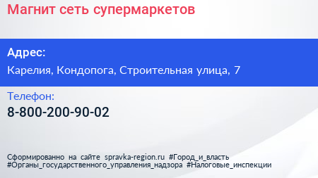 Магнит, сеть супермаркетов по адресу Карелия, Кондопога, Строительная улица, 7 в дальнейшем Организация, размещена в следующих категориях: