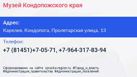 Музей Кондопожского края по адресу Карелия, Кондопога, Пролетарская улица, 13 в дальнейшем Организация, размещена в следующих категориях: