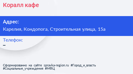 Коралл, кафе по адресу Карелия, Кондопога, Строительная улица, 15а в дальнейшем Организация, размещена в следующих категориях: