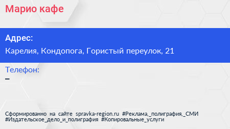 Марио, кафе по адресу Карелия, Кондопога, Гористый переулок, 21 в дальнейшем Организация, размещена в следующих категориях:
