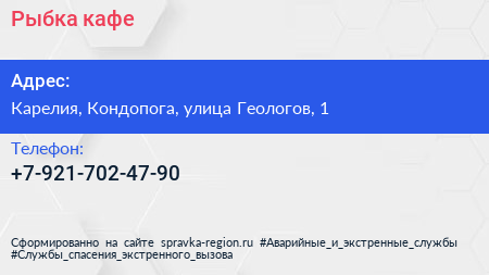 Рыбка, кафе по адресу Карелия, Кондопога, улица Геологов, 1 в дальнейшем Организация, размещена в следующих категориях: