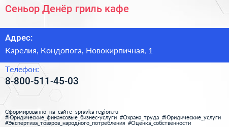 Сеньор-Денёр, гриль-кафе по адресу Карелия, Кондопога, Новокирпичная, 1 в дальнейшем Организация, размещена в следующих категориях: