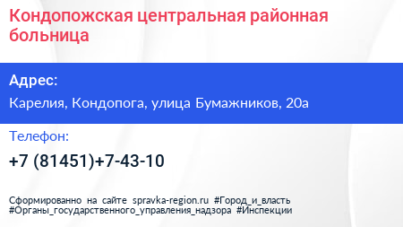 Кондопожская центральная районная больница по адресу Карелия, Кондопога, улица Бумажников, 20а в дальнейшем Организация, размещена в следующих категориях:
