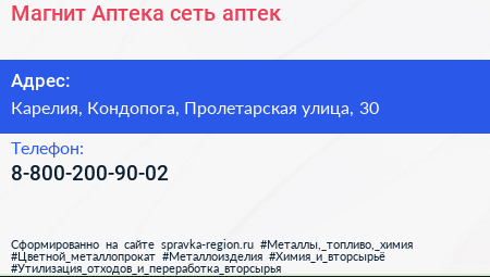 Магнит Аптека, сеть аптек по адресу Карелия, Кондопога, Пролетарская улица, 30 в дальнейшем Организация, размещена в следующих категориях: