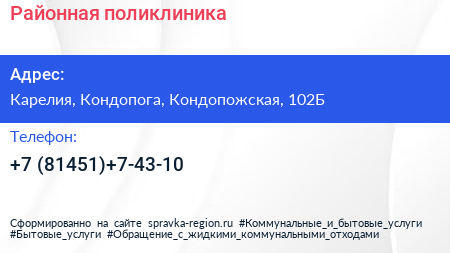 Районная поликлиника по адресу Карелия, Кондопога, Кондопожская, 102Б в дальнейшем Организация, размещена в следующих категориях: